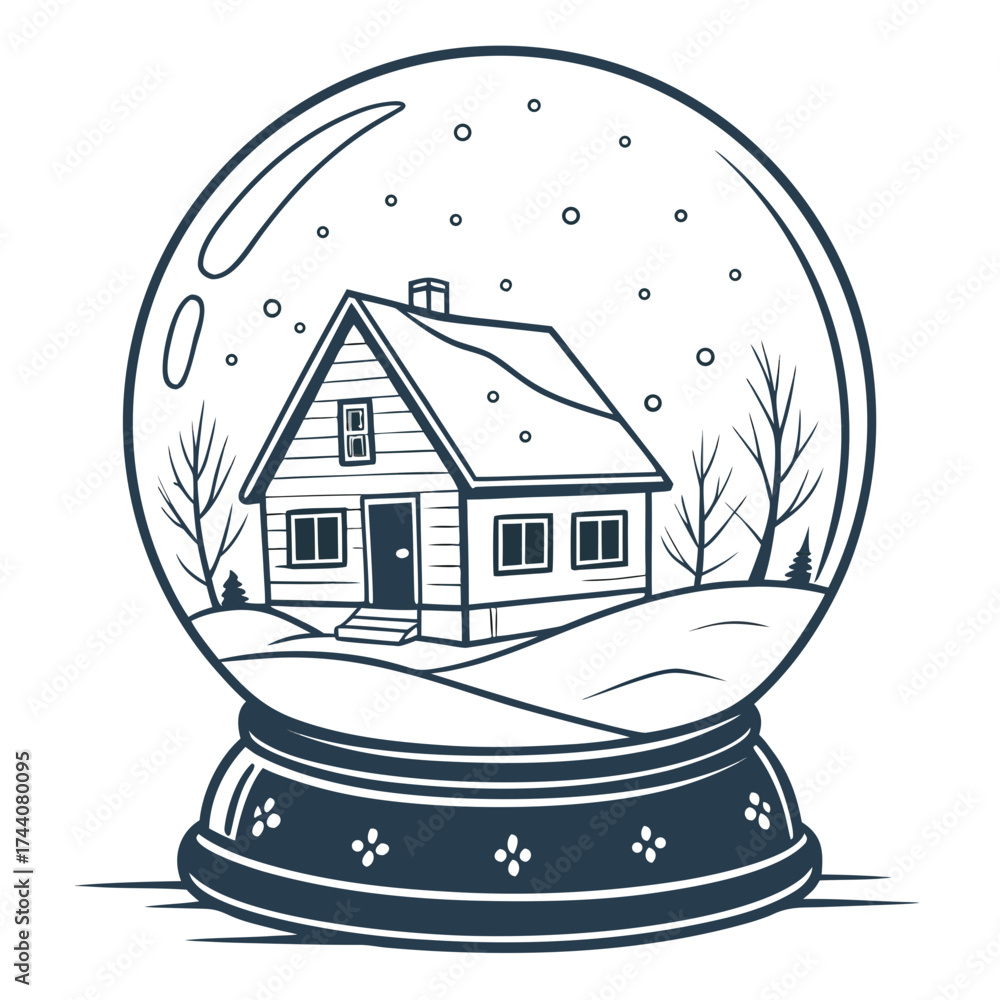 Stylized outline illustration of a charming snow globe containing a cozy winter cabin surrounded by bare trees and falling snowflakes on a snowy landscape #1744080095