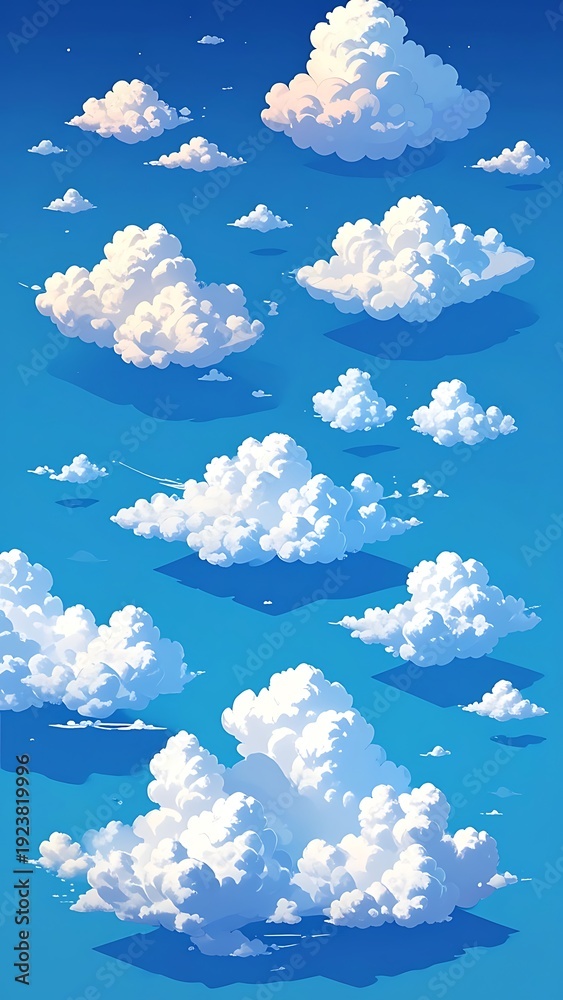 Stylized view upwards to a clear blue sky with many soft, puffy white clouds floating at varying distances #1923819996