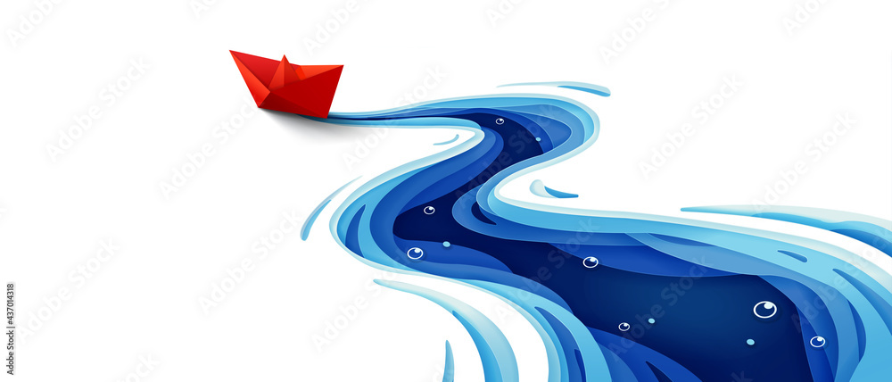 Success leadership concept, The journey of the origami red paper boat on winding blue river, Paper art design banner background #437014318