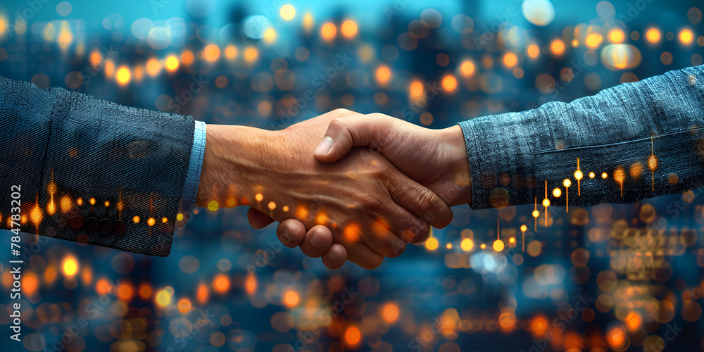 Successful business merger handshake with upward graphs symbolizing growth and teamwork in a corporate cityscape #784783202