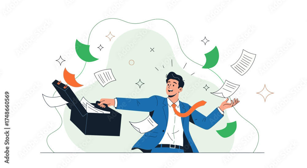 Successful Entrepreneur Celebrates Financial Triumph Amidst Flying Documents and Money #1748660569