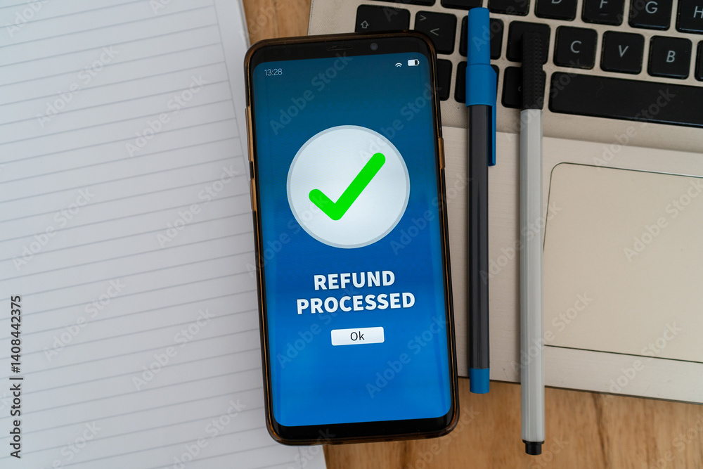 Successful refund process notification on smartphone app. Concept of getting your money back. #1408442375