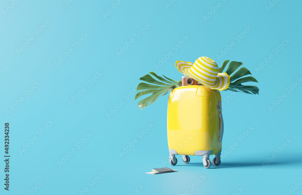 suitcase with travel accessories on blue background. travel concept. 3d rendering #492334238