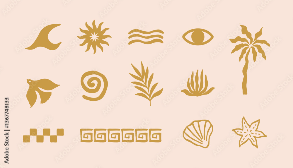 Summer boho beach sea elements set. Vector vacation logo and travel print design templates. Tropical concept illustration. #1367748133