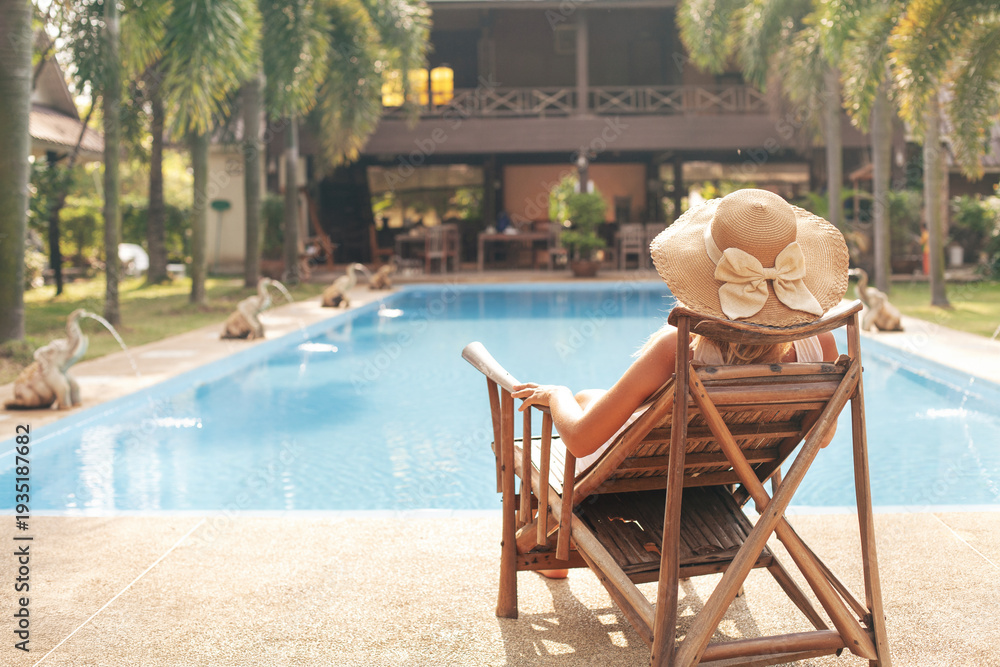 summer holidays, woman in hat relaxing near swimming pool in luxury hotel #1935187682