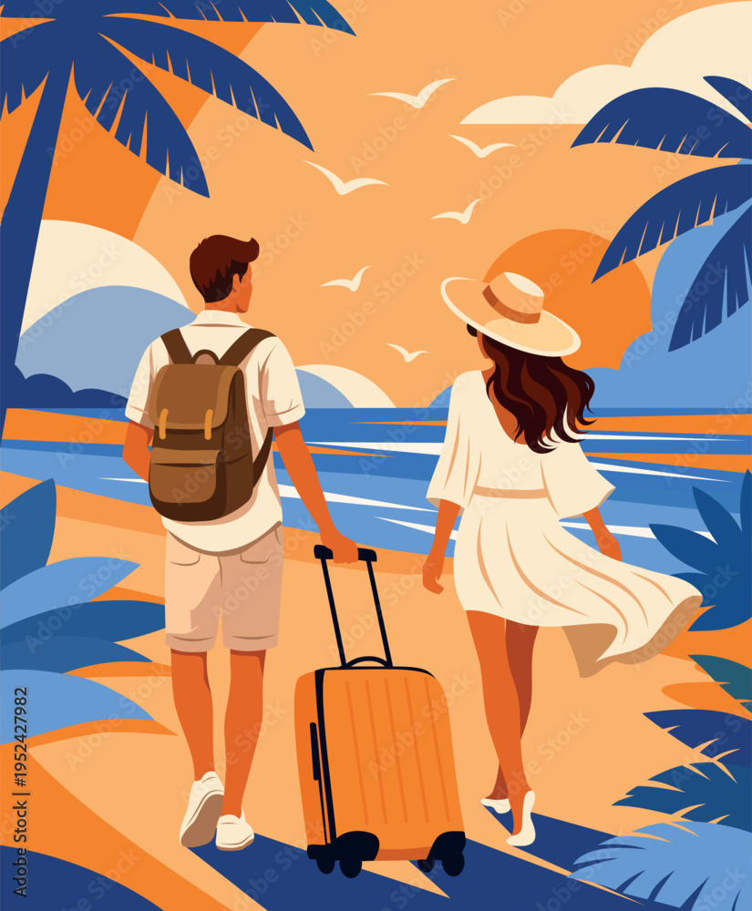 Summer vacation. Vector illustration, couple on vacation, strolling along the beach. Man carries backpack, suitcase, woman in hat. Palm trees, sunset, seagulls. For travel brochures, hotels, tourism. #1952427982