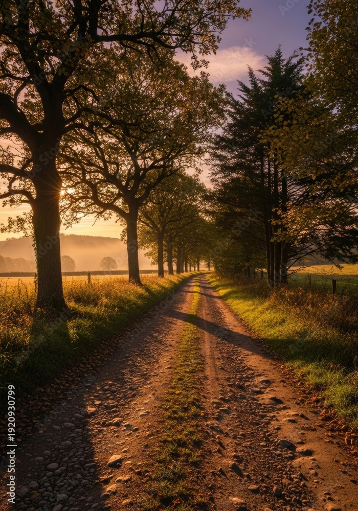 Sun drenched rural dirt road lined with mature trees and fields bathed in warm golden hour light casting long shadows evoking a sense of peaceful journey and natural beauty #1920930799