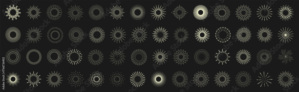 Sunburst elements with light rays. Radiant circular symbols for highlight and magic effect. Useful for retro and spiritual themes #1766736402