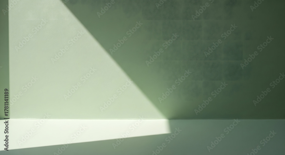 Sunlight and shadow creating graphic shapes on a green surface, Abstract minimalist background with light and shadow on a textured green wall #1781141189