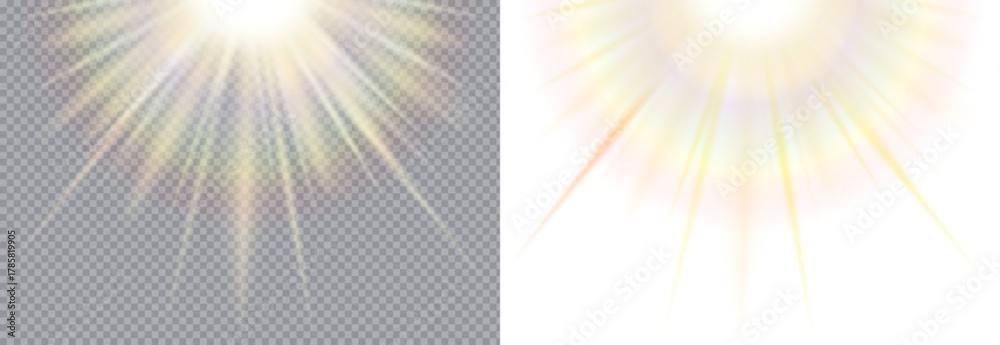 Sunlight beam with rainbow glow and transparency, creating a bright and magical overlay effect. Great for design, illustration, and light textures. Rainbow light rays. Colorful sunlight overlay. #1785819905