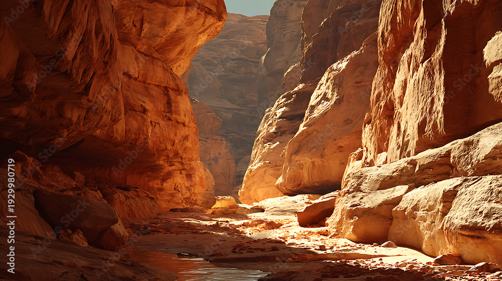 Sunlight Illuminates A Narrow Desert Canyon With A Rocky Floor And Reflecting Water Below #1929980719