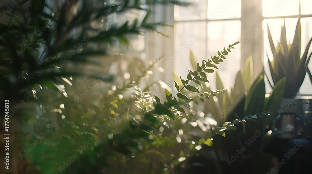 Sunlight streaming through fence and grass with tropical trees and plants #1774745813