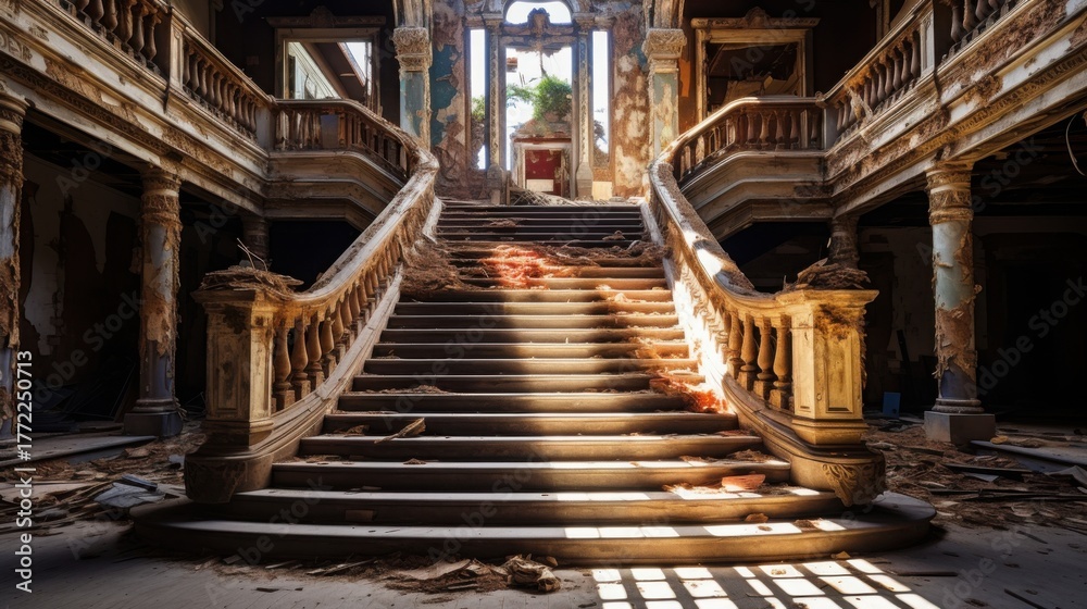 Sunlight streams through large windows, casting light on an ornate staircase covered with leaves and debris, highlighting the beauty of decay in a once-grand hall. #1772250713