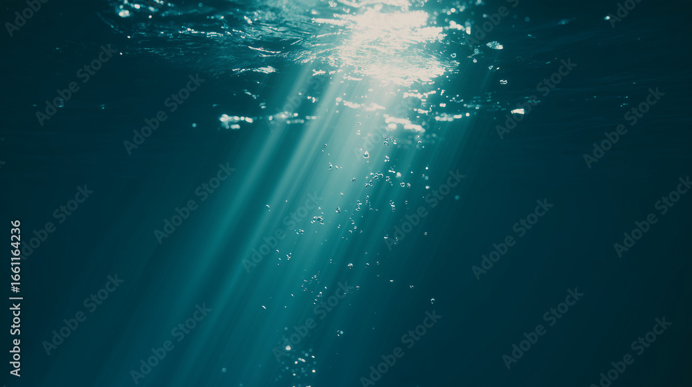 Sunlight streams through ocean waves, creating a mesmerizing play of light and shadow in deep blue waters. #1661164236