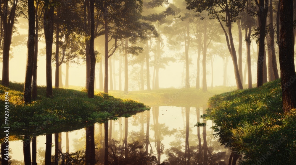 Sunlit forest with reflective pond and golden morning light through tall trees #1920766094