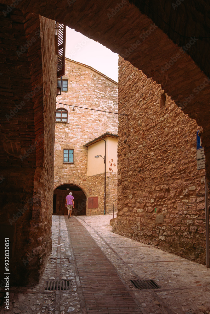Sunlit medieval stone arch framing narrow alley in historic Italian village #1922830851