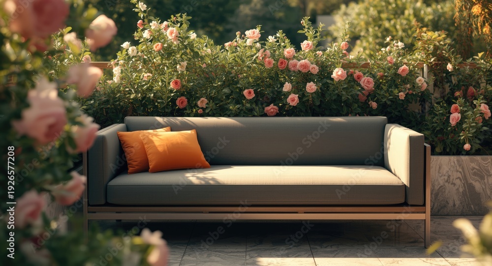Sunlit summer cafe terrace scene containing gray lounge sofa and vivid orange pillow with flowering scenery #1926577208