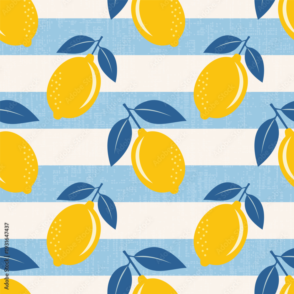 Sunny Sicilian Lemons on wide white and blue stripes, seamless summer vector pattern, perfect summer mood illustration #1931647437