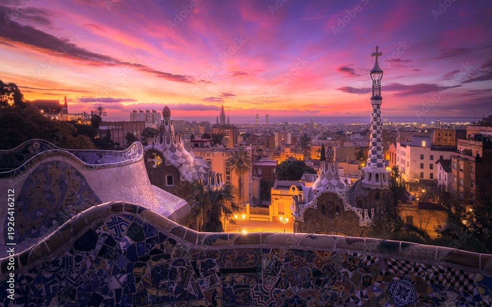 Sunrise Casts a Magical Glow Over Barcelona From the Vibrant Park Guell in Catalonia, Revealing an Enchanting Urban Landscape #1926416212