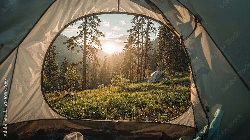 Sunrise inside a Tent, Scenic mountain camp scene with a view of green meadow and forest in morning sunshine through an open tent door. #1769572560