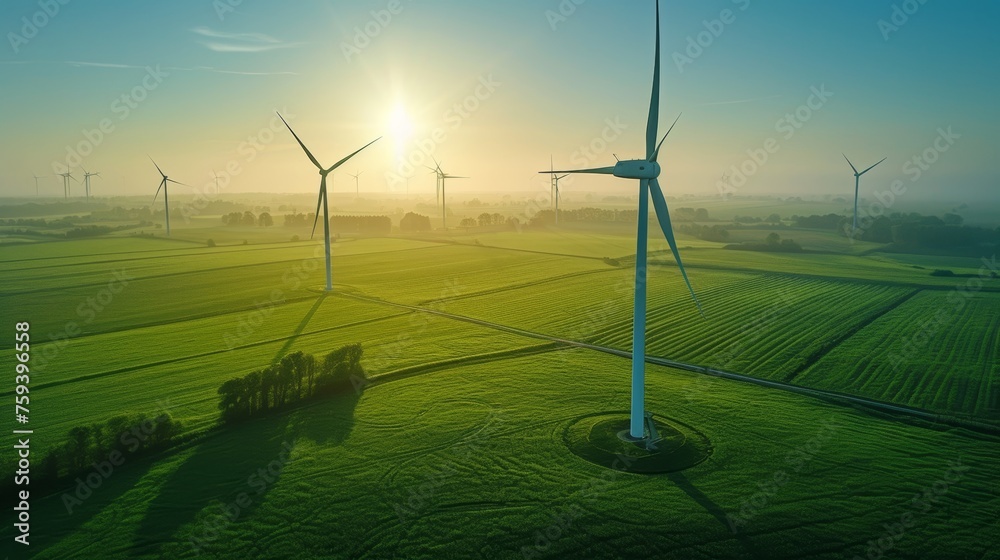 Sunrise Over Green Wind Turbine Field #759396558