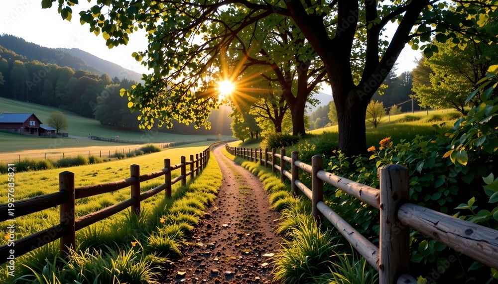 Sunrise Over Rustic Fence and Lush Hillside Path #1937685821