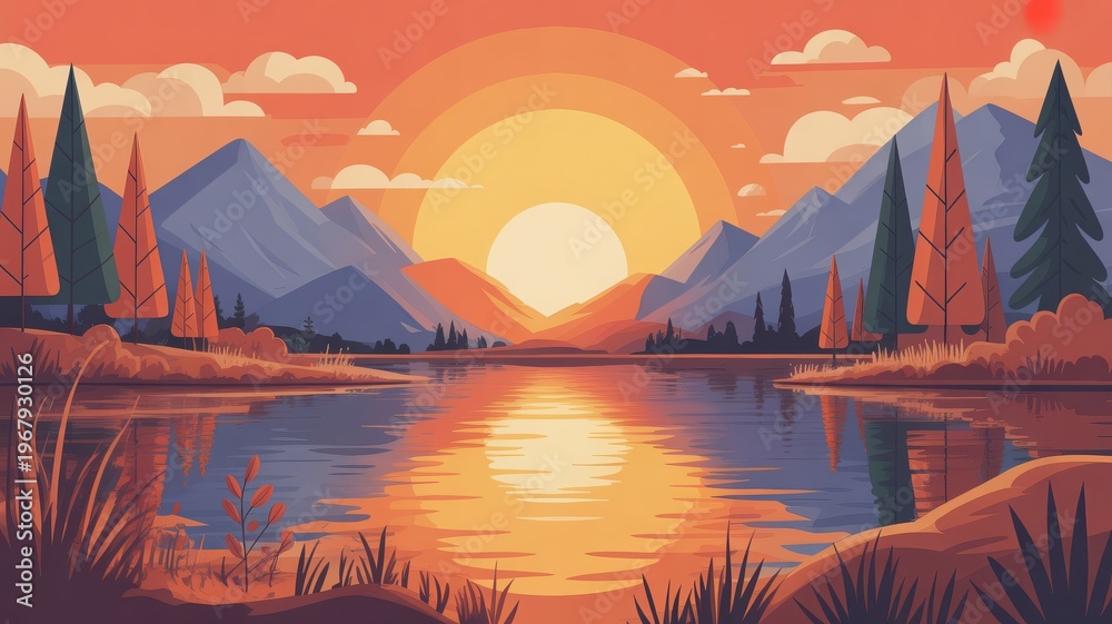 Sunset mountain lake landscape with reflective water and pine trees #1967930126
