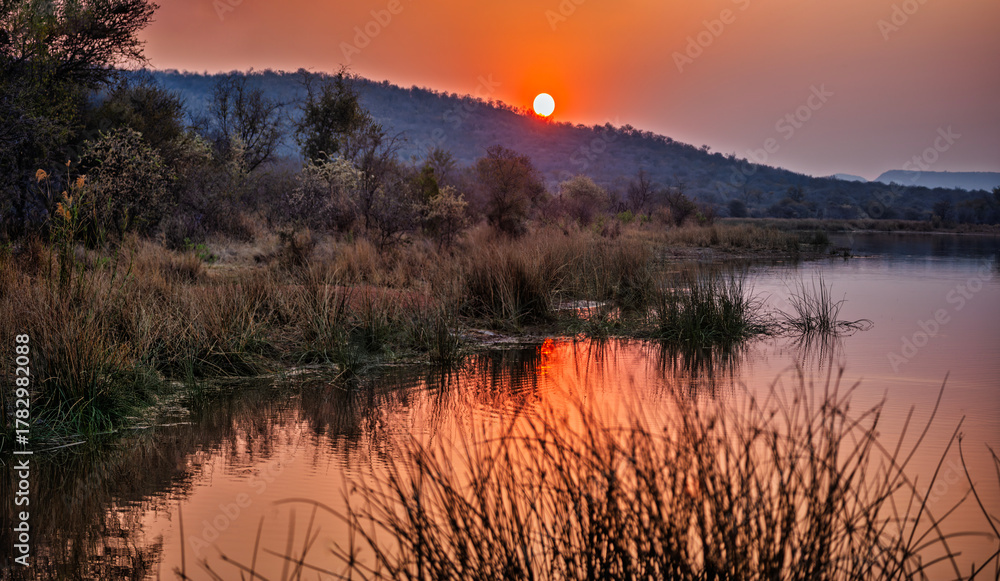 sunset over a body of water dam at Mokolodi Nature Reserve, located near Gaborone, Botswana #1782982088