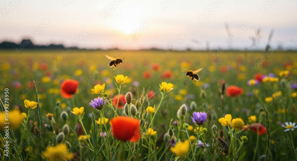 Sunset Serene Meadow: Bees in Flight over Vibrant Wildflowers #1399278950
