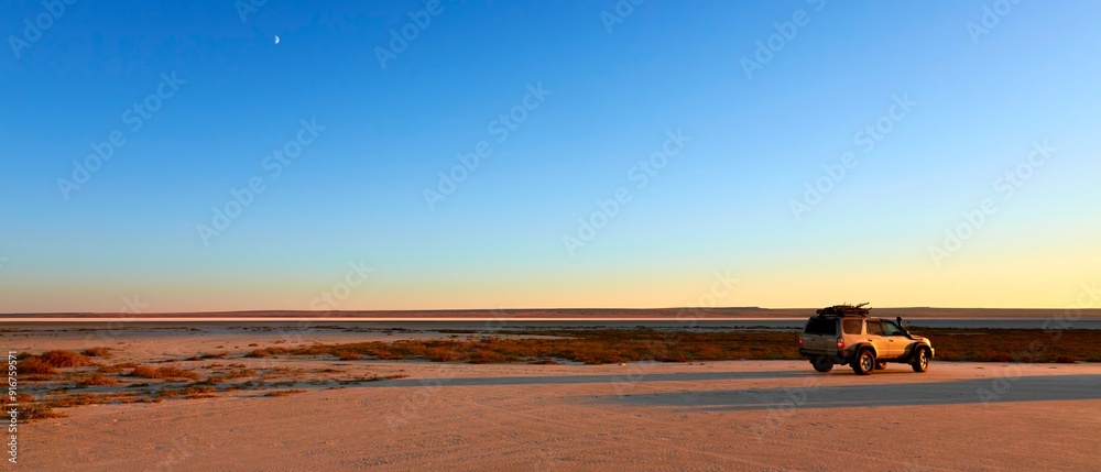 (Super wide view) SUV and tent night in the glow of the Golden Hour in Mangistau, Kazakhstan #916759571