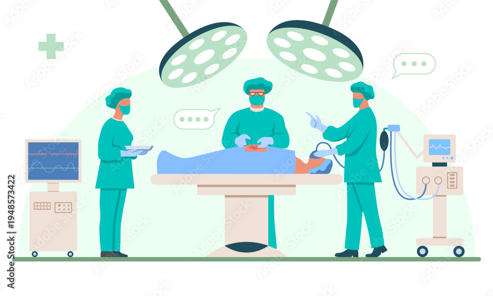 Surgical operation. Male surgeon, anesthesiologist and female nurse perform medical operation on patient on operating table. Doctor performs surgery. Flat vector illustration isolated on background #1948573422
