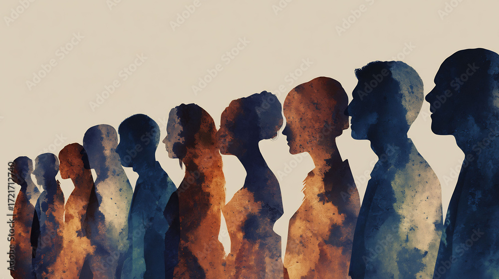 Surreal conceptual illustration of human silhouettes standing line blending into one another symbolizing conformity behavior and group dynamics in psychology no text clean background #1721712740
