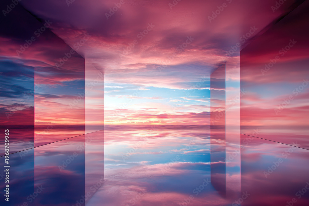 Surreal mirrored hallway with dreamy sunset sky #1968709963