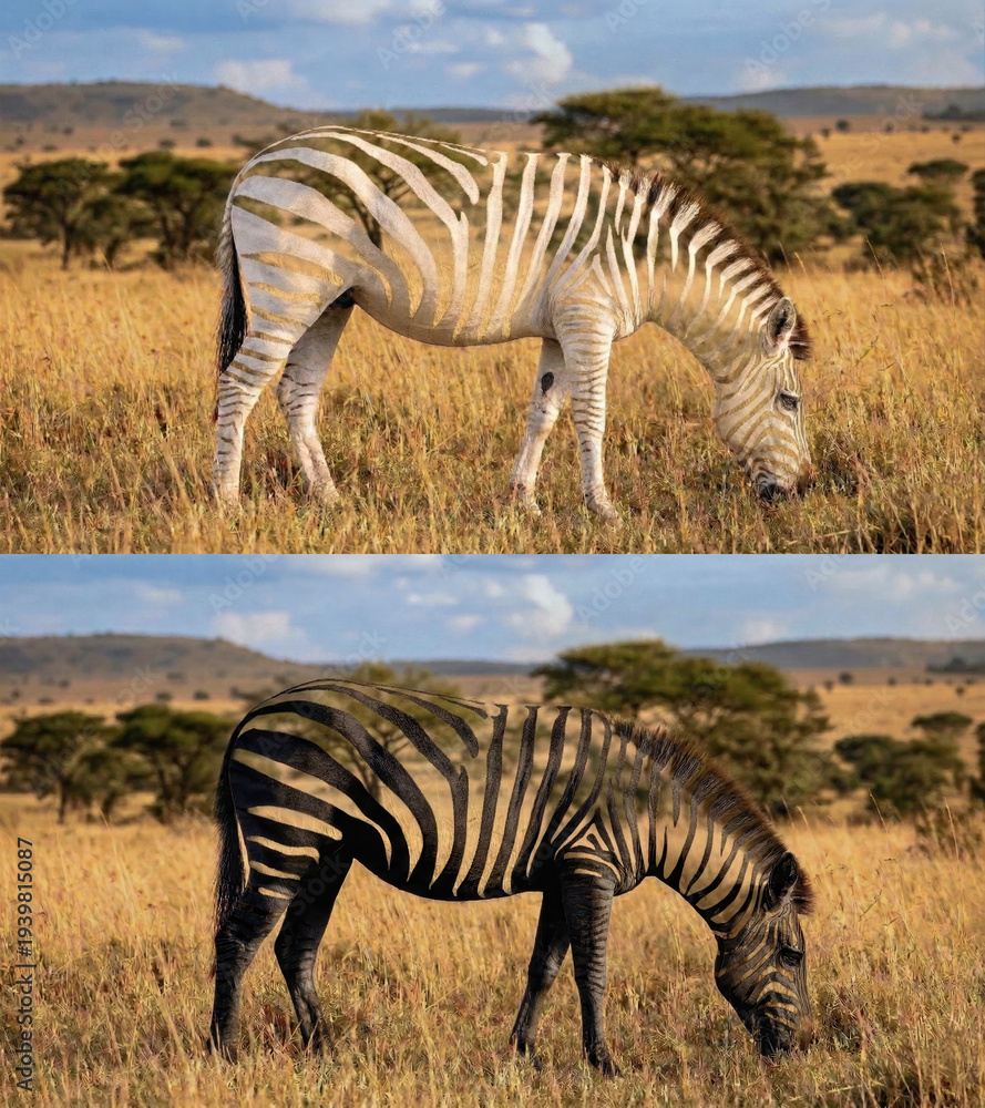 Surreal optical illusion of grazing savanna zebras featuring transparent stripes revealing the golden grass background, a creative wildlife camouflage concept composite. #1939815087