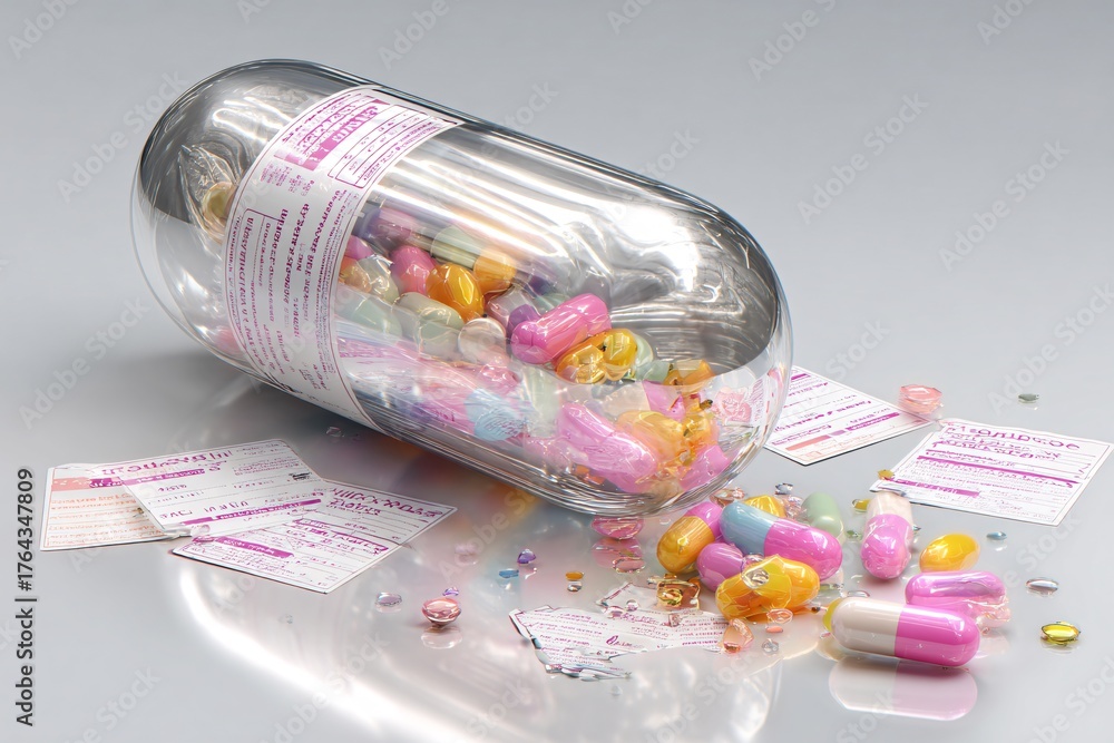 Surreal scene of a shattered piggy bank shaped like a pill capsule, spilling vibrant pills and coins onto a reflective white surface, with scattered insurance documents around, representing the #1764347809