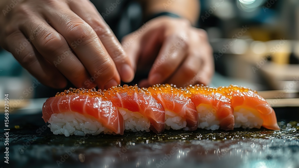 Sushi Master Crafting Nigiri - Rice Adhering to Nori with Bluefin Tuna Belly Oil Refraction #1568927094