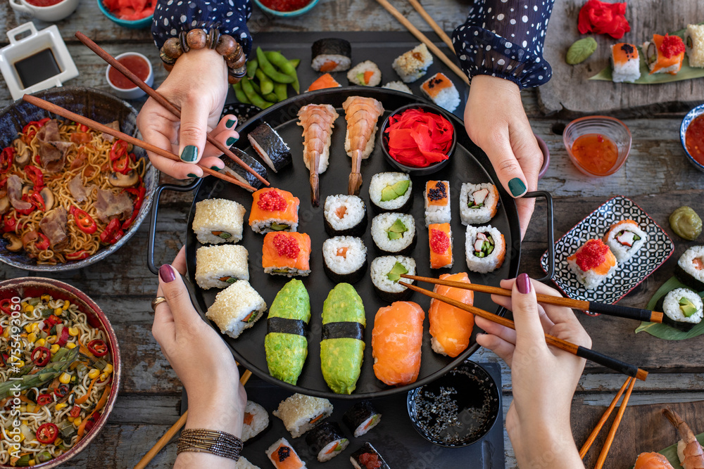 Sushi rolls like Philadelphia roll, dragon roll and California roll with salmon, crab and calamari. Unrecognizable people enjoying a sushi meal with chopsticks #1755493050
