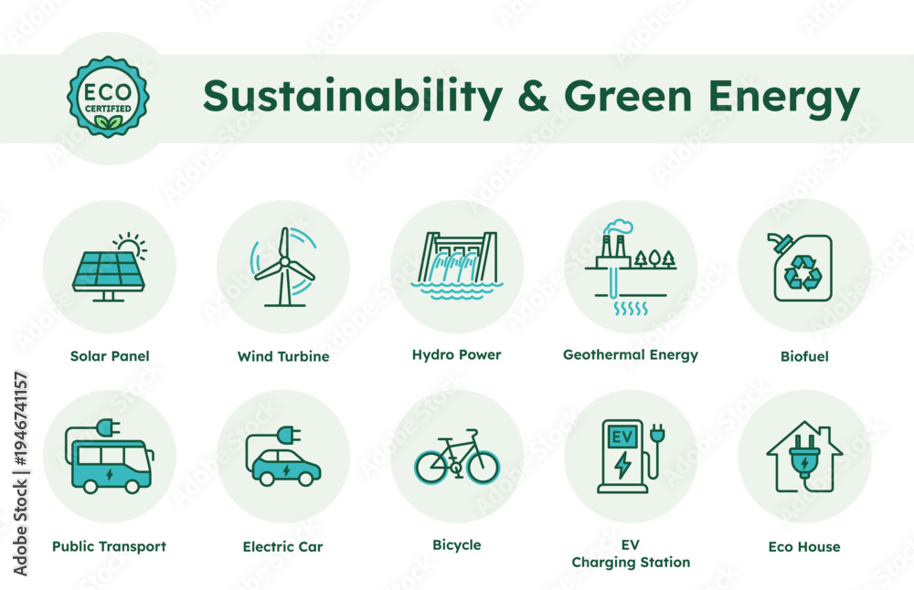 Sustainability and green energy vector icons set with editable stroke. Eco-friendly renewable energy sources, electric vehicle transportation, and eco house concepts. #1946741157