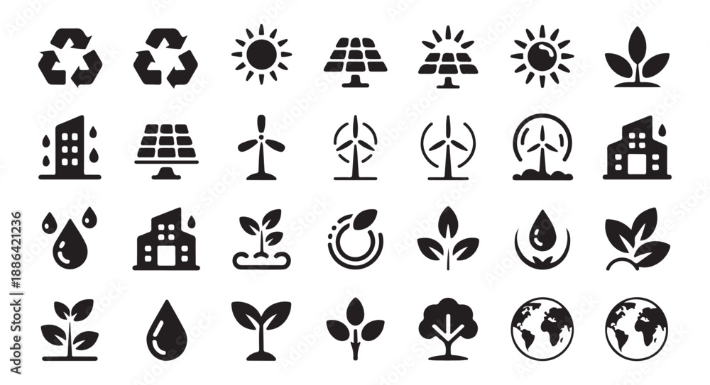 Sustainability icons collection with solar power wind energy recycling signs and diverse leaf plant silhouettes #1886421236