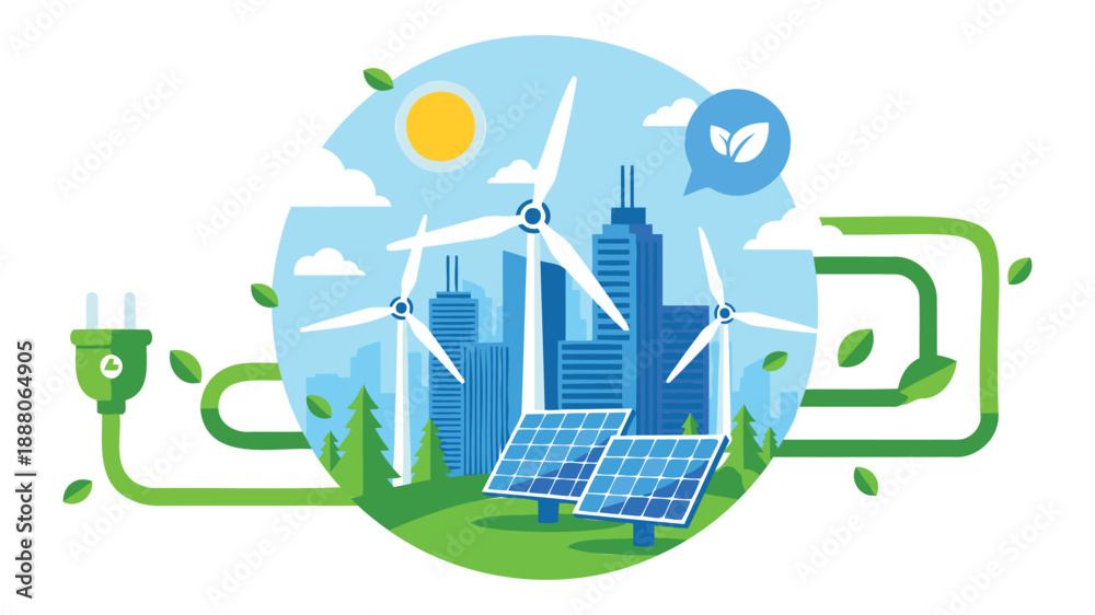 Sustainable city with renewable energy sources and eco-friendly technology illustration #1888064905