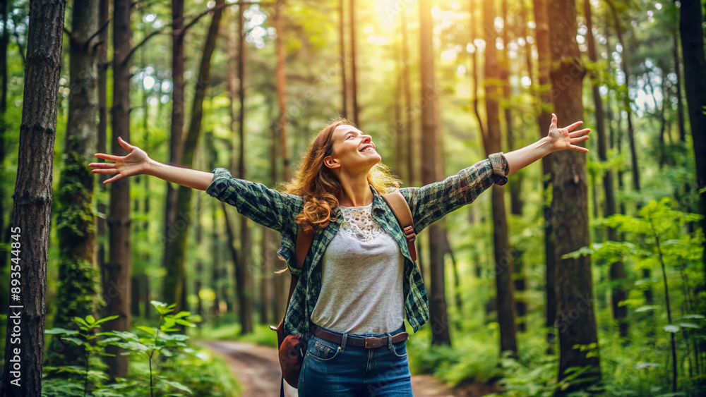 Sustainable eco friendly fashion clothes woman feeling free with open arms in woods forest happy breating clean air Travel tourist girl walking in natural healthy environment renewable resource #893544845