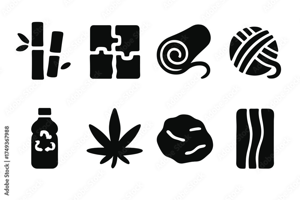 Sustainable Icons Grid. Sustainable Materials. Filled icon set of Sustainable Materials: bamboo, cork tile, #1749367988