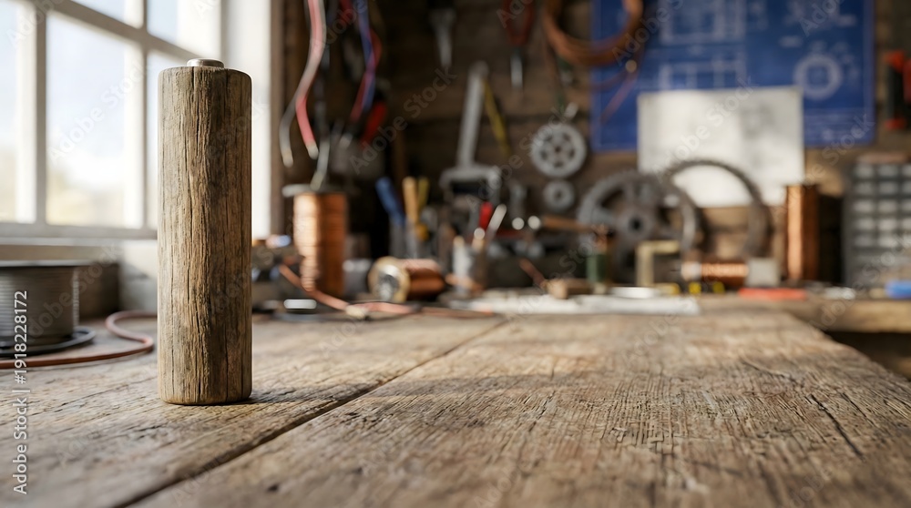 Sustainable Wooden AA Battery Prototype on Cluttered Inventor Workbench with Tools #1918228172