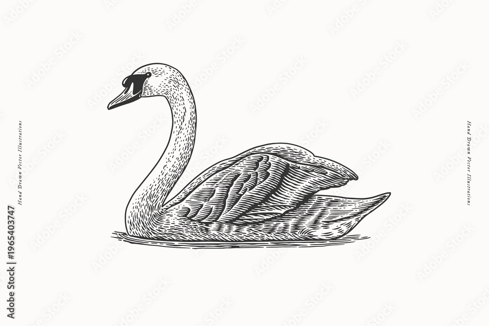 Swan swimming on water. Hand drawn vector engraving illustration isolated on light background. Water bird and wildlife vintage line art style. Side view #1965403747