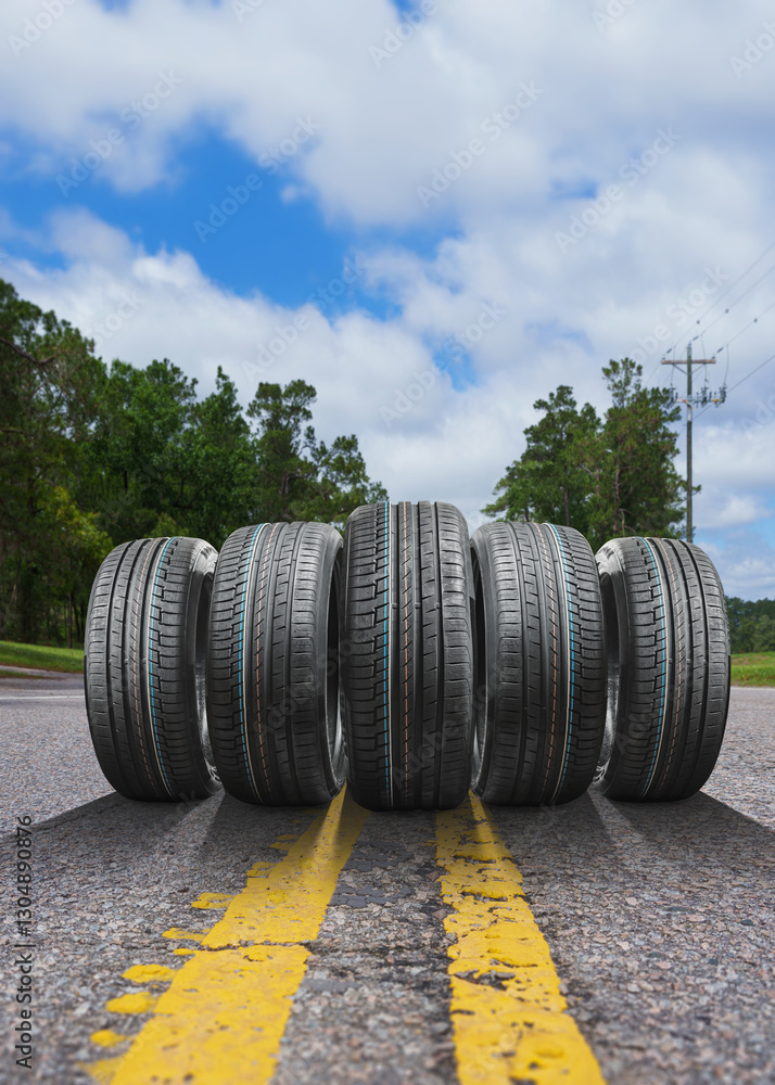 Swap winter tires for summer tires - time for summer tires. Poster with copy space. #1304890876