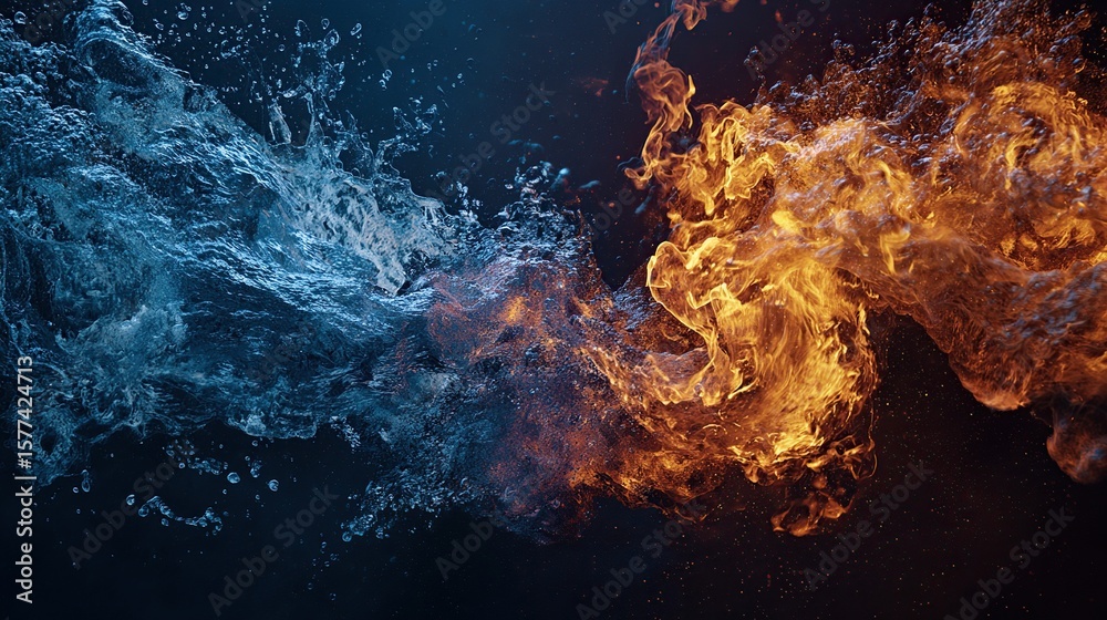 Swirling water and fire clash abstractly on a dark background #1577424713