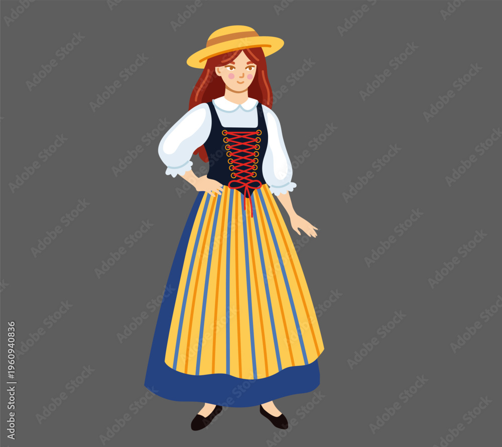Swiss woman wearing traditional costume. Switzerland. National clothes. Folk ethnic dress. European girl. Hand-drawn vector illustration. #1960940836