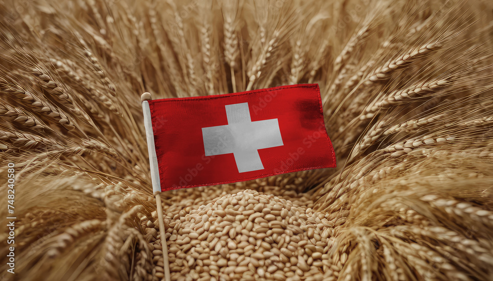 Switzerland flag on barley grain. Origin of barley, agribusiness of growing barley #748240580