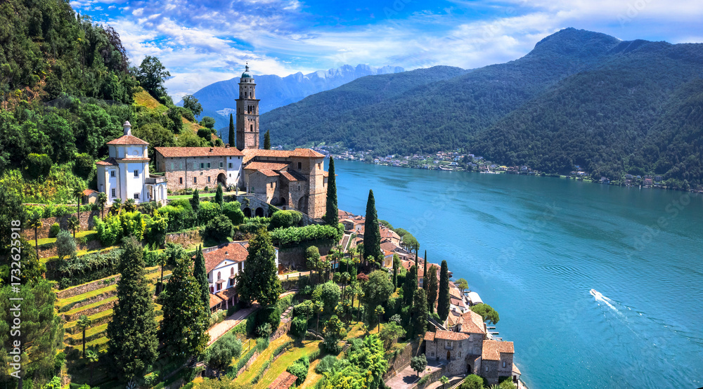 Switzerland tourism, picturesque lake Lugano canton Ticino. Morcote is one of the most beautiful villages, panoramic view #1732625918