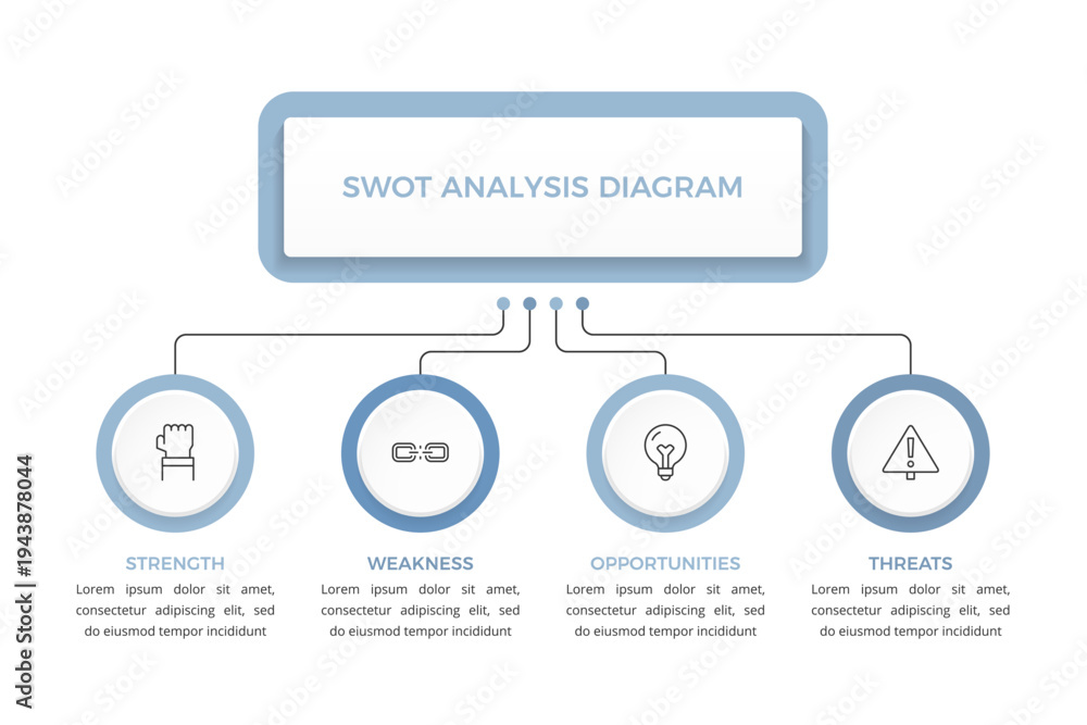 SWOT analysis infographic template with four categories strength, weakness, opportunities and threats with icons and text space #1943878044